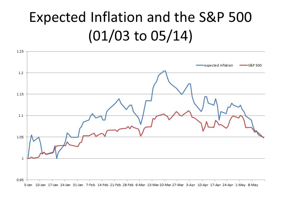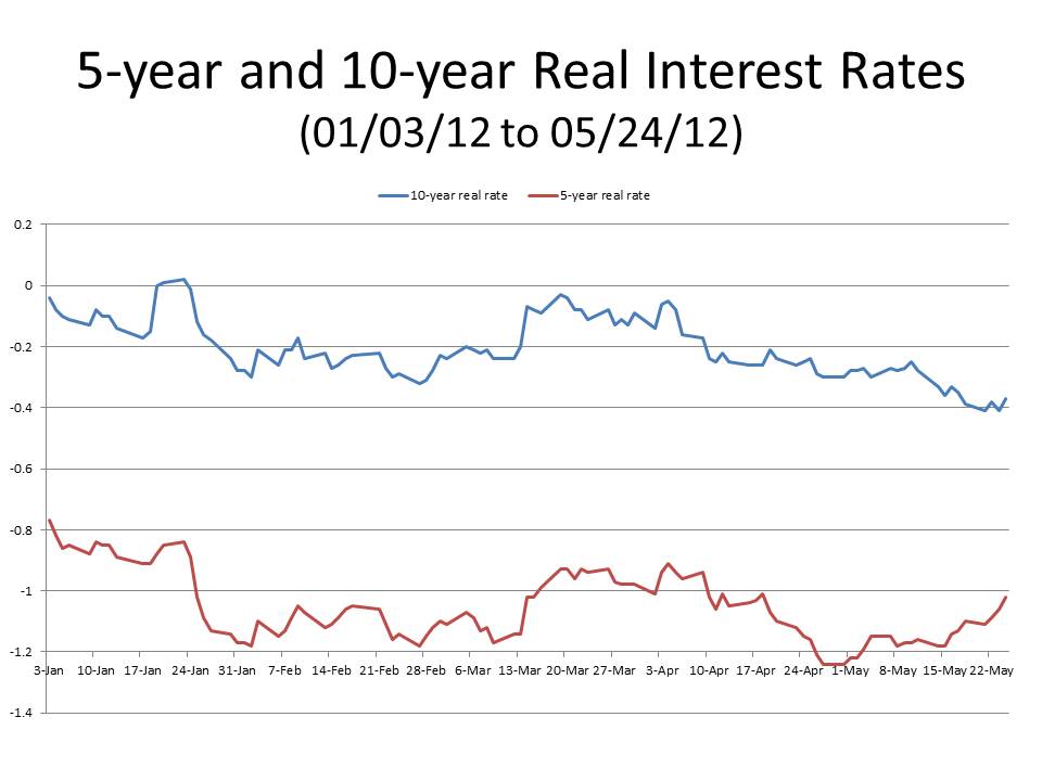 In a post last week, I pointed out that there was a highly unusual inverse correlation between the 5- and 10-year real interest rates as approximately reflected in constant maturity 5- and 10-year TIPS. (On the meaning of the term “constant maturity” see the very valuable and informative post in J.P. Koning’s excellent blog summarizing discussions in the many blogs that he follows and comments on) about the various blogs Since early May the correlation coefficient between the yields on constant maturity 5- and 10-year TIPS was about -.72 (as of today it’s -.77), while the correlation coefficient between the two yields since the start of 2012 was .86. It occurred to me after writing the post (I added an update to make the point) that one reason for the inverse correlation might be an increased in the expected likelihood of a financial crisis, in which case real short-term interest rates would rise during the crisis as people expecting to be short of cash bid up real rates trying to get their hands on cash ahead of the crisis, while also selling off assets (either fixed capital or inventories).
