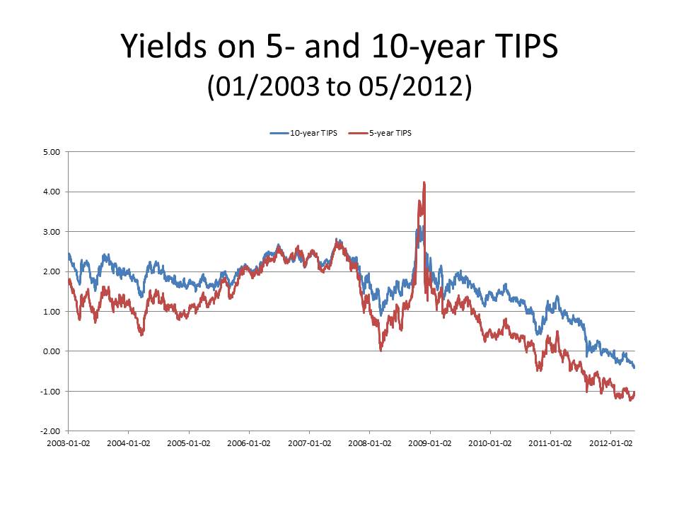 A second graph displaying the difference between the yields on the 10-year and the 5-year TIPS is also useful, clearly showing the effect of the spike in short-term real interest rates at the height of the financial crisis.