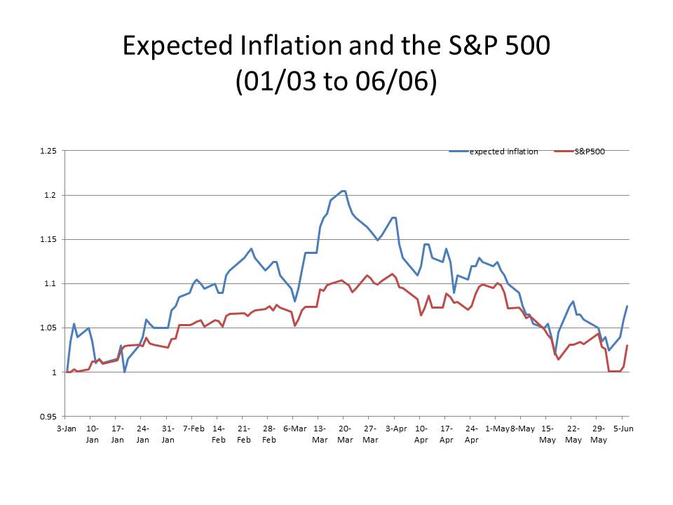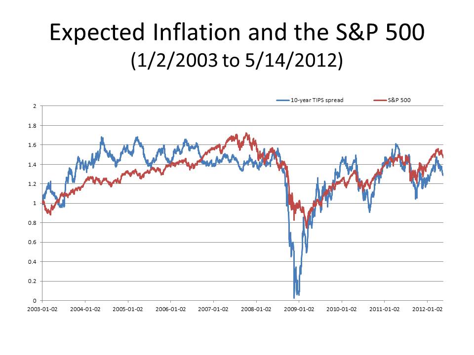 Two points to make about his comment.  First, if Fact Checker had read Yglesias’s post carefully, or, better yet, actually read my post (let alone the original paper on which the post was based), he would have realized that my whole point is that the close correlation between expected inflation and stock prices is generally not observed, and that one would expect to observe the correlation only when deflation exceeds the real rate of interest (as it does now when slightly positive expected inflation exceeds the negative real real rate of interest).  So the fact that the correlation doesn’t work through time was precisely the point of my post.  Second, the graphs to which Fact Checker links use survey data by the University of Michigan of the inflation expectations of households.  I do not totally discount such data, but I regard survey estimates of expected inflation as much less reliable than the implicit market expectations of inflation reflected in the TIPS spread.