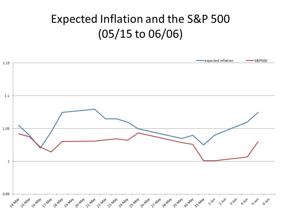 What does it teach us? There still seems to be a correlation between inflation expectations and stock prices, but it is not as close as it was until three weeks ago. I confirmed this by computing the correlation coefficient between inflation expectations and the S&P 500 from January 3 to May 14. The correlation was .9. Since May 14, the correlation is only .4. That is a relatively weak correlation, but one should note that there are other three-week periods between January 3 and May 14 in which the correlation between inflation expectations and stock prices is even lower than .4. Still, one can’t exclude the possibility that the last three weeks involve some change in circumstances that has altered the relationship between inflation expectations and stock prices. The chart below plots the movement in inflation expectations and stock prices for just the last three weeks.
